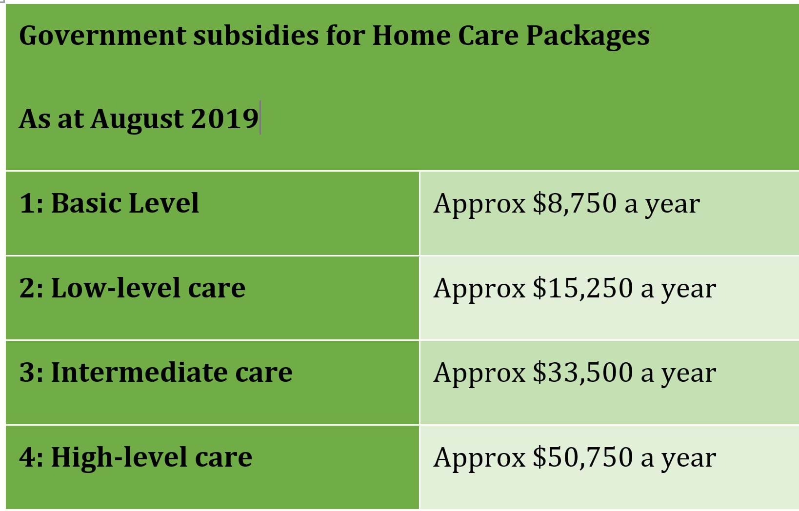 There are four levels of Home Care Packages with different funding amounts ranging from basic needs to high care needs.